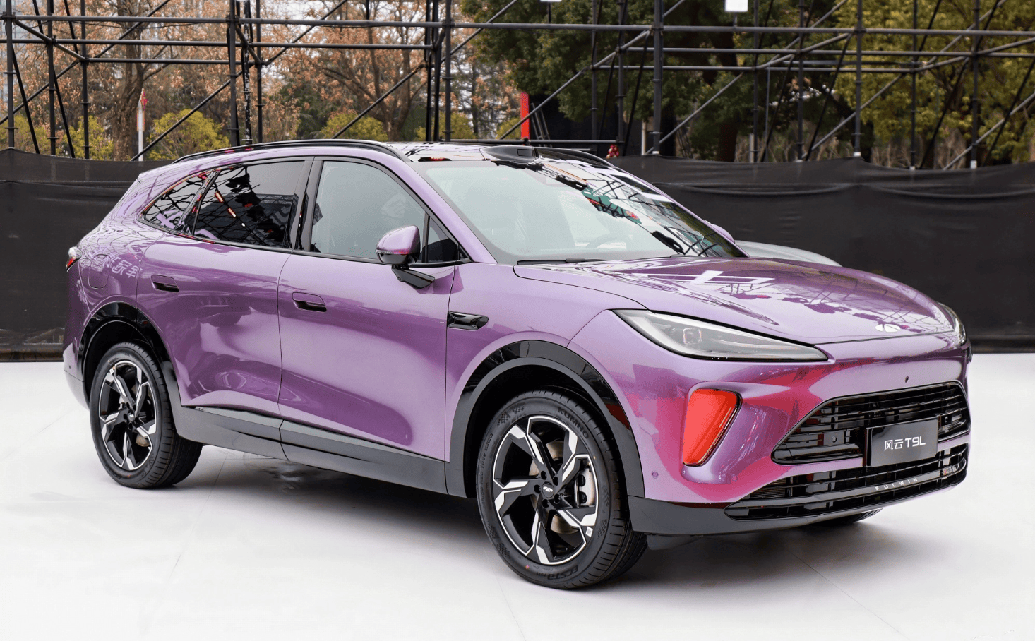 车身尺寸长宽高分别为4870*1930*1710mm,轴距2920mm,相比同级宋L DM-i、海狮06DM-i等更大一些。车身侧面采用饱满、敦实的溜背式造型,配合大量熏黑饰件,很有运动感。而半隐藏式门把手、无边框外后视镜、花瓣式轮毂以及贯穿式尾灯的加持,再配合紫色涂装,又进一步提升了时尚感。尾部大面积熏黑后包围处又加入夸张的扩散器,加之环形尾翼,继续强调性能感。