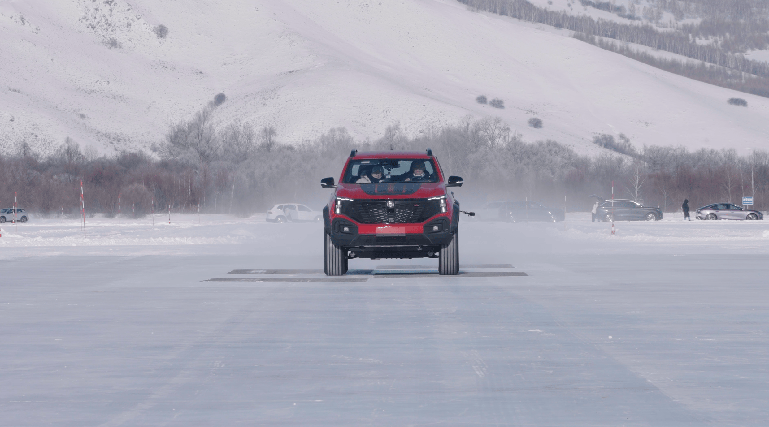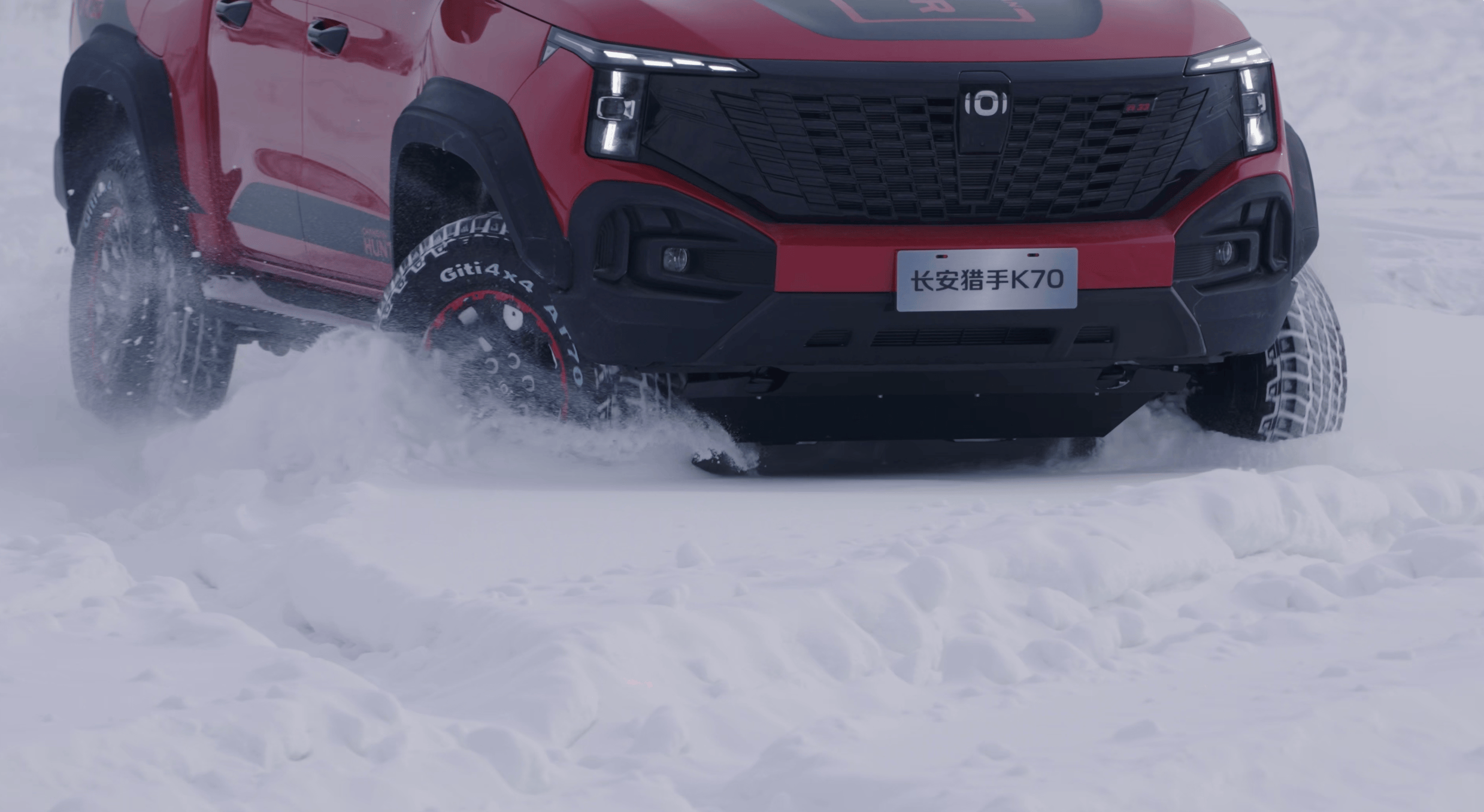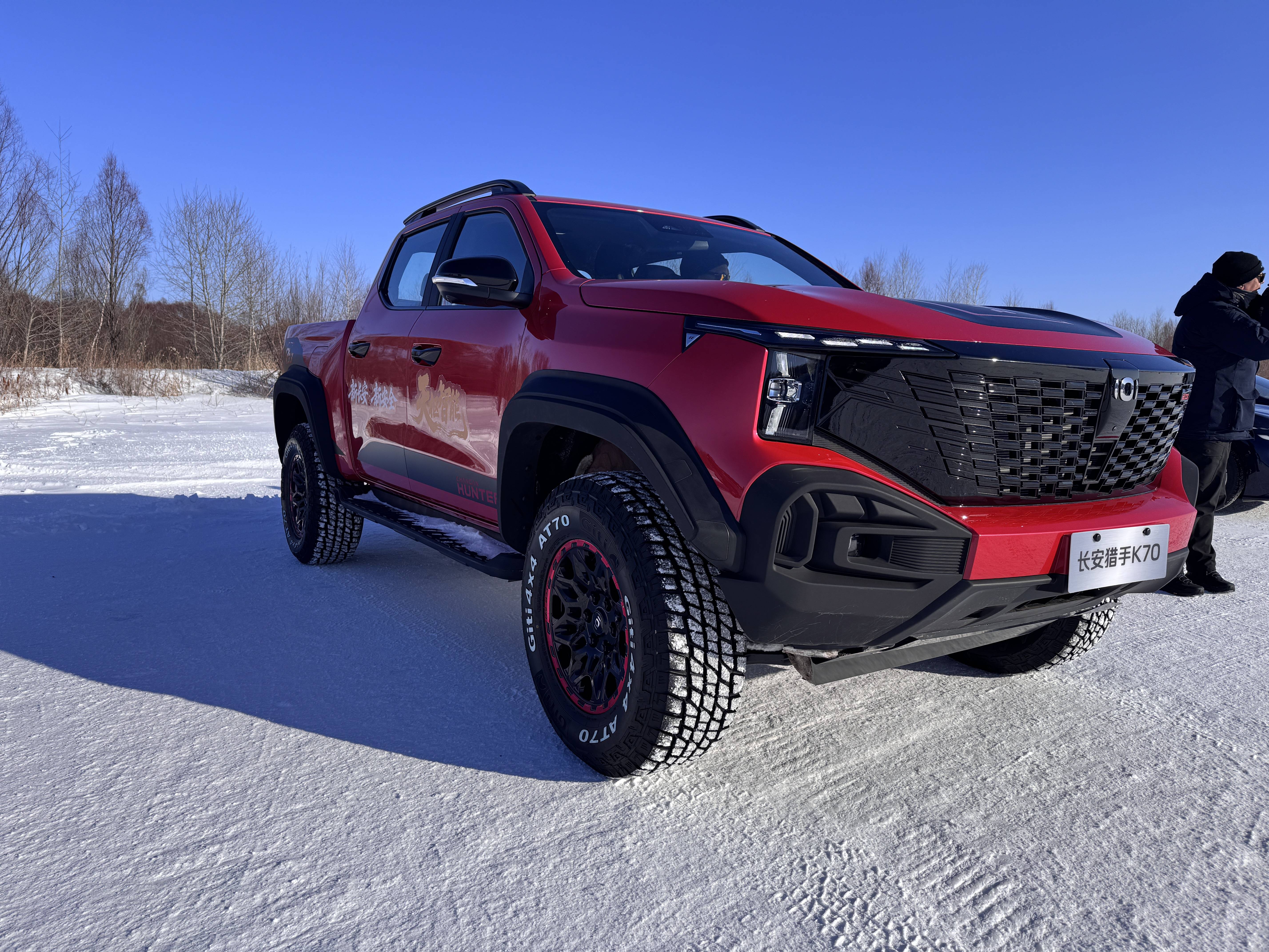 而江山红这抹新车色,在一片白茫茫的冰雪世界里格外醒目。它并不是张扬的亮红,而是一种更厚重、更有力量感的红色,和猎手K70本身强调的越野属性高度契合。